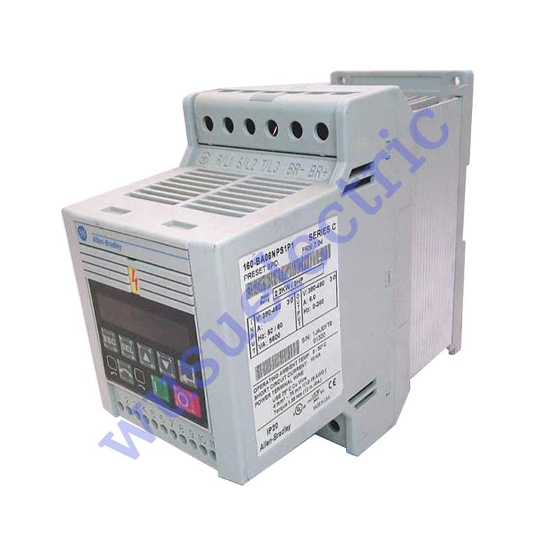 The 160-BA06NPS1 is part of the bulletin 160 Smart Speed Controller (SSC) series by Allen-Bradley. This device is specifically a Variable Speed Drive (VSD) which is more popularly termed as Variable Frequency Drive (VFD). It is mainly used to implement modulating speed control of industrial, 3-phase AC motors. The 160-BA06NPS1 is a Preset Speed Model drive. With preset speed, this drive implements speed modulation via predefined speed settings configured by the user stored in drive parameters 61-68. This drive allows the configuration of up to 8 preset speeds and 2 acceleration and deceleration settings. The preset speeds are delivered by the 160-BA06NPS1 to the output terminals when triggered by the external switches wired to the open collector inputs available to the input terminals of this drive. Aside from these inputs, the 160-BA06NPS1 has a Form C relay contact output that can be used with resistive and inductive loads. The 160-BA06NPS1’s nominal input voltage rating is 380-460 VAC, 3-Phase along with an input current of 7.0 Amperes. It has an output voltage of 380-460 VAC, 3-Phase, the programmable output frequency of 0-240 Hz, output current, and power of 6.0 Amperes and 3.0 HP or 2.2 kW, respectively. This drive has an IP20 rated enclosure with an ambient temperature of 0 to 50 Degree Celsius storage temperature of -40 to 85 Degree Celsius and relative humidity of 0-95%, non-condensing. This drive implements Pulse Width Algorithm (PWM) technology and IGBT circuit for generating 3-Phase output frequency. It implements speed control using the Volts/Hertz (V/Hz) control method.