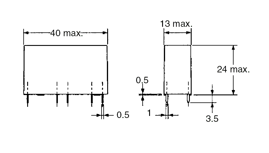 | Insulation resistance | Between coil and contacts: 1000 MΩ min. (at 500 VDC) Between contacts of different polarity: 1000 MΩ min. (at 500 VDC) Between contacts of same polarity: 1000 MΩ min. (at 500 VDC) |