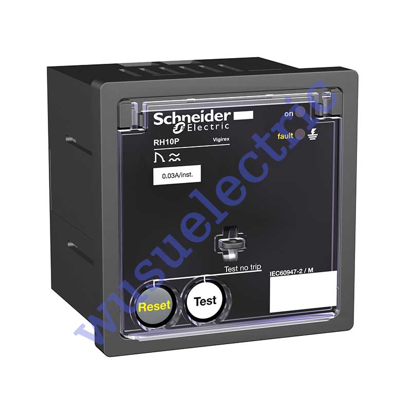 In StockVigiPacT RH10P is a front panel mounting residual current protection relay. It protects against people direct or indirect contact, property fire hazards and motors. It measures the earth leakage current in an electrical installation via its associated toroid. It trips the associated circuit breaker when the set residual operation current is overrun. The operational supply voltage is 220/240VAC 50/60Hz. It is a type A earth-leakage protection class. The current sensitivity (IDn) is fixed to 30mA. The time delay (Dt) is instantaneous. It requires a local manual reset after a fault clearance. The monitored distribution system voltage is up to 1000VAC 50/60/400Hz. It is installed on a front panel switchboard and the protection degree is IP40. It must be associated with a compatible Schneider Electric type A toroid or rectangular sensor.